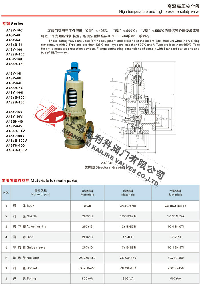 聲明:【A44Y,A48Y高溫高壓蒸汽安全閥】規格型號、結構尺寸由上海凱利科閥門有限公司提供,如何選擇適用的A44Y,A48Y高溫高壓蒸汽安全閥產品,使之在工藝控制中安全可靠、經濟適用,可致電我司銷售部門及技術部門,我們將在最短的時間內為您解答!
