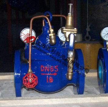 900X消防緊急關(guān)閉閥當(dāng)出口壓力低于導(dǎo)閥設(shè)定的壓力時(shí),導(dǎo)閥此時(shí)處于開通狀態(tài),主閥上腔壓力與主閥出口壓力相等,進(jìn)口與吃口存在壓差,水流經(jīng)閥口出口流出,當(dāng)消防泵氣泵時(shí),或變平泵壓力升高時(shí),超過導(dǎo)閥設(shè)定壓力,由主閥進(jìn)口向?qū)чy管控制室壓力升高,作用在彈簧壓力增大,向下壓緊,帶動閥芯下移,使導(dǎo)閥關(guān)閉,此時(shí)主閥進(jìn)口壓力通過節(jié)流閥補(bǔ)充到主閥閥蓋上腔,因閥瓣受到向下壓力大于向上推力,主閥關(guān)閉。值得注意的是,進(jìn)口壓力小于設(shè)定壓力是,主閥處于開啟狀態(tài),進(jìn)口壓力大于設(shè)定壓力,閥瓣關(guān)閉。