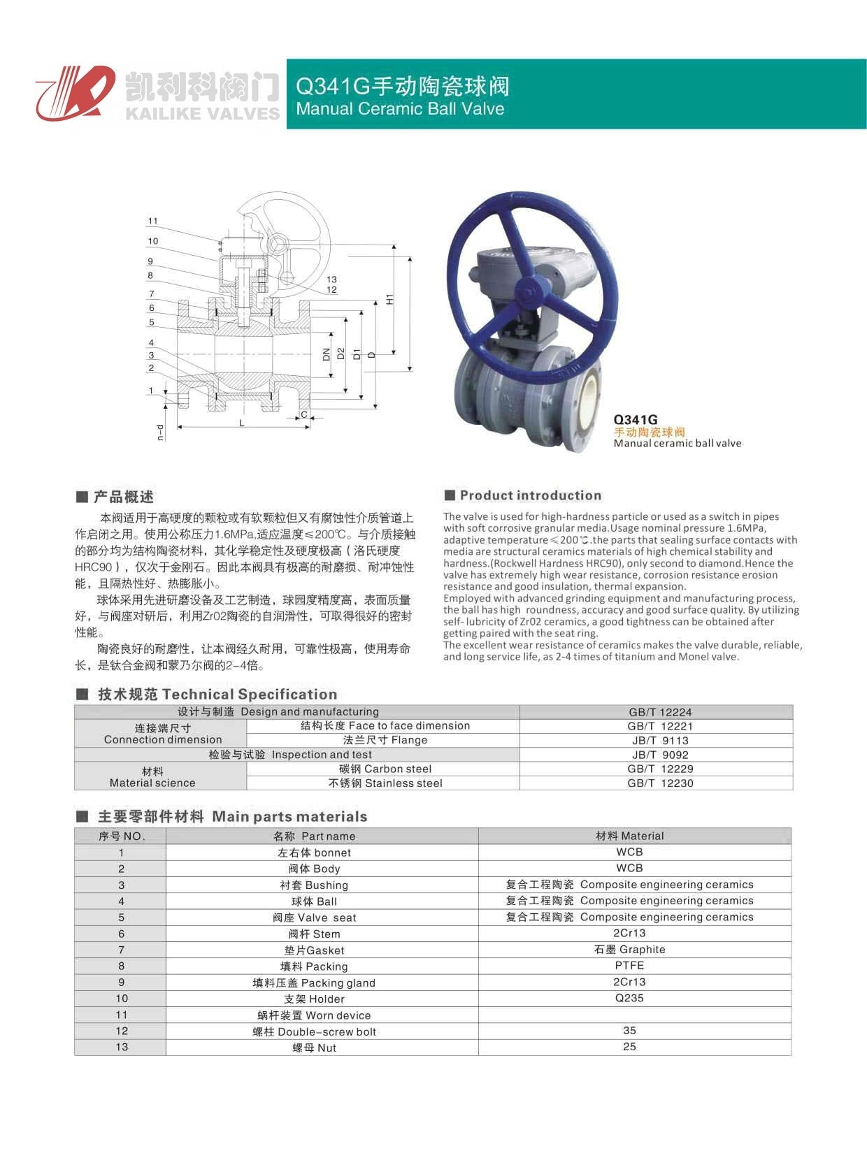 陶瓷球閥本閥適用于高硬度的顆粒或有軟顆粒但又有腐蝕性介質管道上作啟閉之用。使用公稱壓力1.6MPa,適應溫度≤200℃。與介質接觸的部分均為結構陶瓷材料,其化學穩定性及硬度極高(洛氏硬度HRC90),僅次于金剛石。因此本閥具有極高的耐磨損、耐沖蝕性能,且隔熱性好、熱膨脹小。